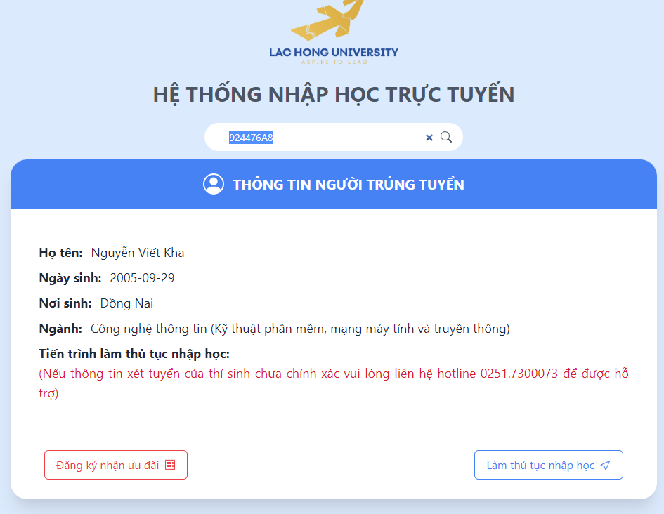 Nhằm giúp thí sinh nhanh chóng tra cứu được kết quả xét tuyển đại học. Đồng thời, đảm bảo đăng ký được đầy đủ các ưu đãi của Trường Đại học Lạc Hồng dành cho Tân sinh viên khóa 2023. Hơn thế nữa, giúp sinh viên không chỉ nhập học trực tiếp mà còn có thể nhập học trực tuyến qua hệ thống của nhà trường, nay nhà trường triển khai các hướng dẫn cụ thể như sau: