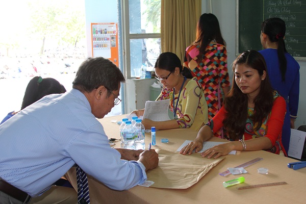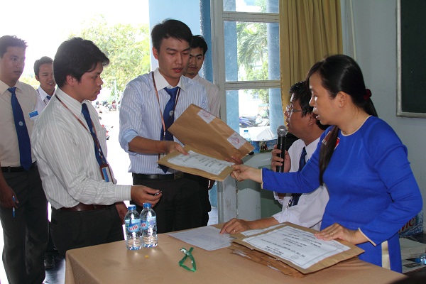 Trước khi giao túi bài thi, Trưởng điểm thi kiểm tra kỹ lưỡng tên của cán bộ phòng thi