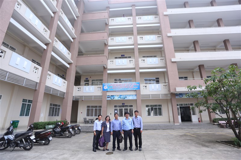 Các chuyên gia trong đoàn đánh giá ngoài chụp hình lưu niệm với lãnh đạo các đơn vị trong trường