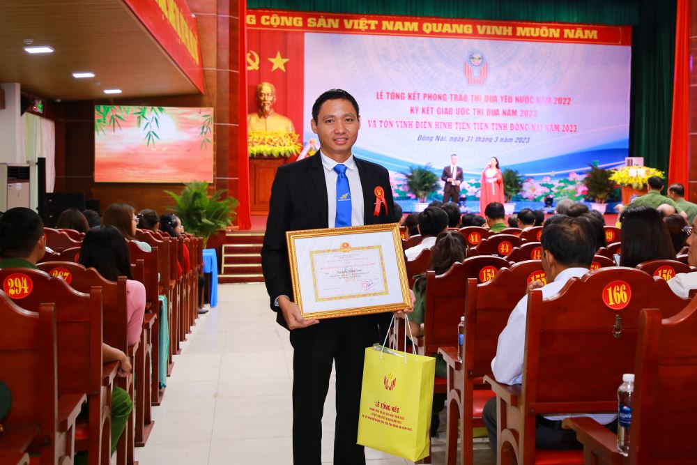 Tại sự kiện, ThS. Nguyễn Minh Sơn - Phó Trưởng Khoa Công nghệ Thông tin vinh dự đón nhận bằng khen điển hình tiên tiến tỉnh Đồng Nai năm 2023, do Ông Cao Tiến Dũng - Chủ tịch UBND tỉnh Đồng Nai trao tặng.